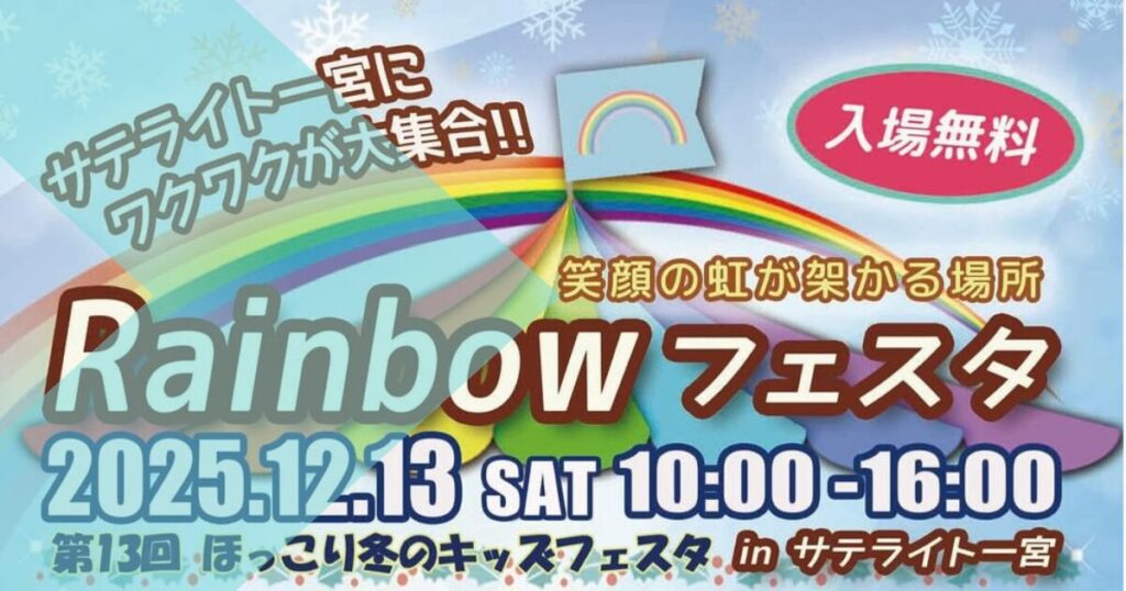 家族で楽しめる冬の恒例イベント「Rainbowフェスタ」が、2025年12月13日(土)に一宮市のサテライト一宮で開催されます。 入場無料で、子どもから大人までワクワクが詰まったコンテンツが盛りだくさん。クリスマス前の休日を、ぜひ家族みんなで楽しんでみ... -